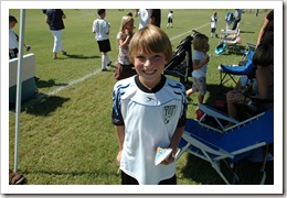 "White Dragons" won their first game and most importantly worked together as a team and had great sportsmanship! For the sake of Ben's mental state I was trying to think of a motivator for Daimon to WANT to kick the ball this year. He loved every minute of soccer last year and spent most of his time on the field shouting encouraging statements to his teammates rather than going after the ball. He was FULL of team spirit and had ZERO competitive spirit! He couldn't wait to play again this year so for a little motivation I told him he would get a quarter each time he kicked the ball during games.....all good parents bribe their children with money right???? Well wouldn't you know it, he earned $1.50 for his first game! Who said money was the root of all evil? That boy is sure motivated now.... way to go son! Ben was so inspired by his son's motivation he decided to run home from the game..... in his state of elation he misjudged the time and temperature and his speculated 1/2 hour run turned into 1 1/2 hours in over 100 degree weather! Maybe I should have promised him quarters too!